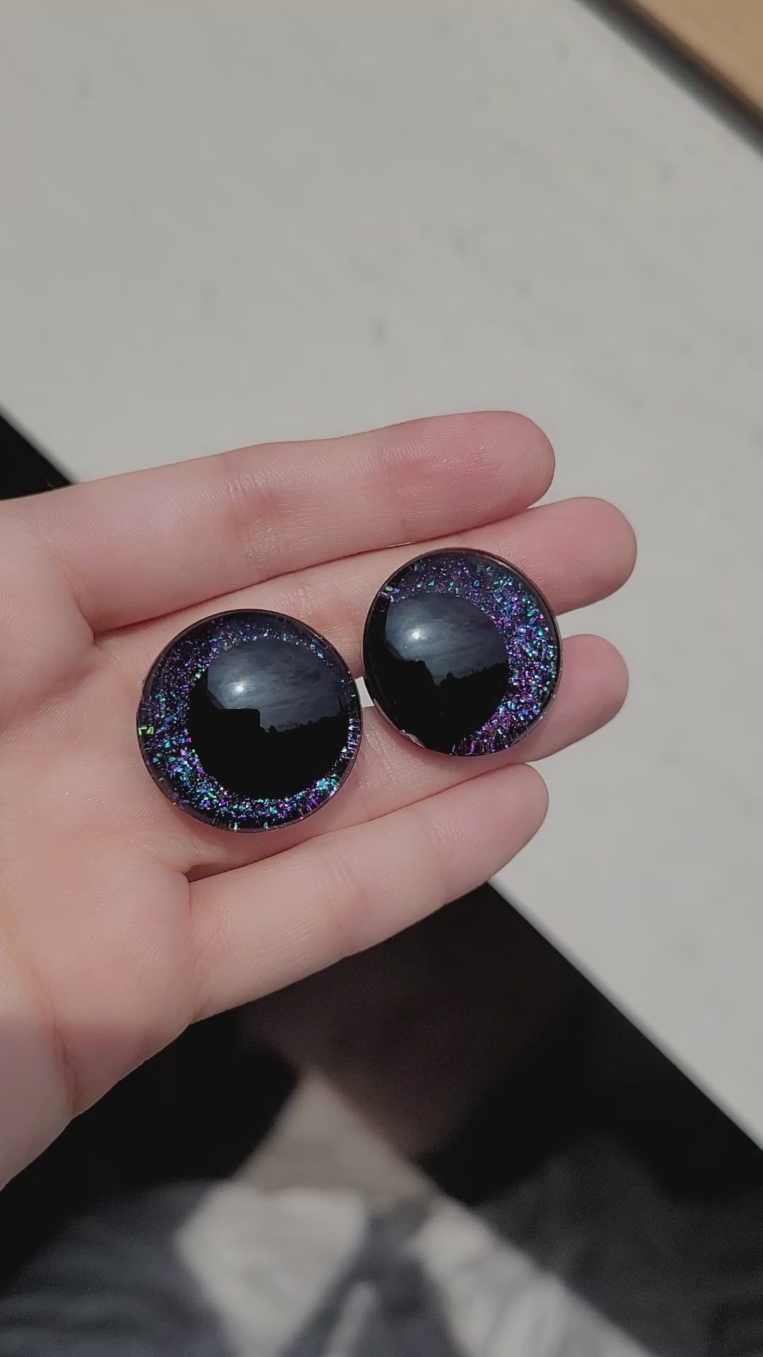 Composition : yeux en plastique, paillettes et résine UV
